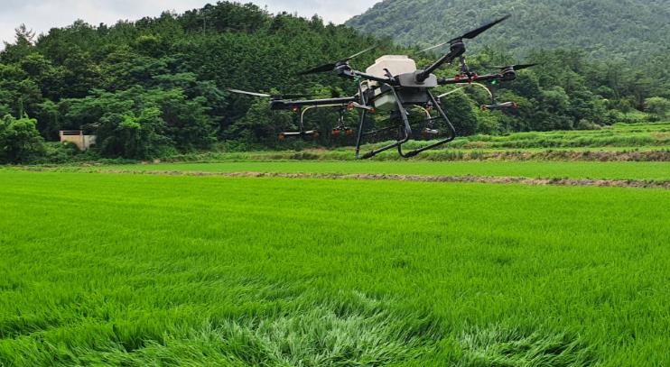 | ▲ 벼 재배포장에서 드론을 이용해 이삭거름을 살포하는 모습 |