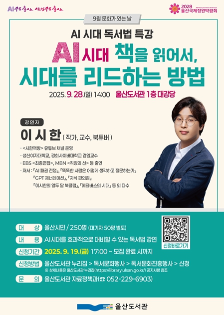 [무한뉴스=최진수 기자] 울산도서관은 9월 문화가 있는 날을 맞아 오는 9월 27일 작은 음악회 ‘빛나는 시작, 우리의 노래’를, 9월 28일 이시한 작가의 ‘인공지능(AI) 시대 책을 읽어서, 시대를 이끄는(리드하는) 방법’ 특강을 양일간 개최한다고 밝혔다.
