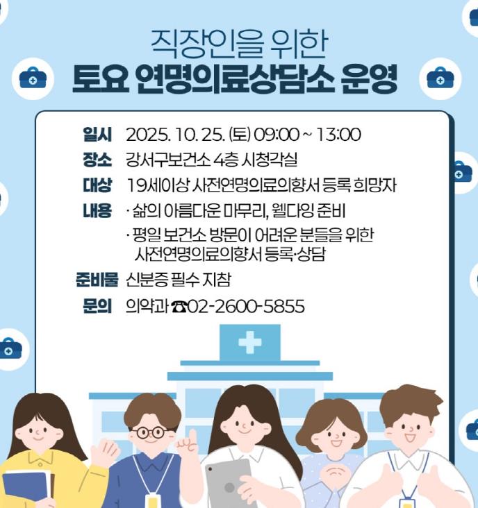 [무한뉴스=정승훈 기자] 서울 강서구는 평일 보건소 방문이 어려운 직장인과 주민들을 위해 ‘토요 연명의료상담소’를 운영한다.