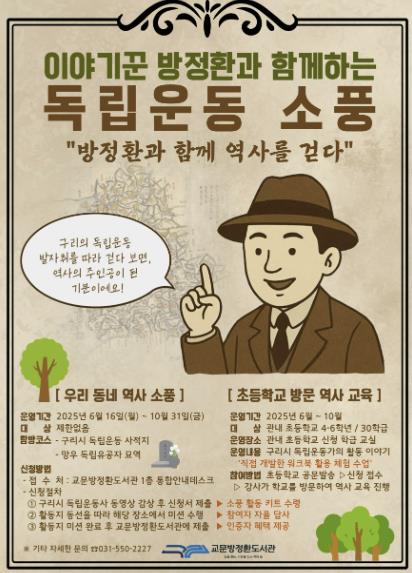 이 사업은 경기도 주관의 '광복 80주년 기념 문화사업' 시군 공모에 선정되어 도비 5,200만원을 지원받아 추진된 것으로, 구리시의 역사·문화 자원을 발굴하여 시민들과 함께 체험하는 내용으로 기획됐으며, 세부 내용은 ▲‘이야기꾼 방정환’이 들려주는 구리시 독립운동사 영상 감상 ▲구리시 독립운동 사적지 및 망우 독립유공자 묘역 탐방 ▲초등학교 방문 역사 교육 등이다.