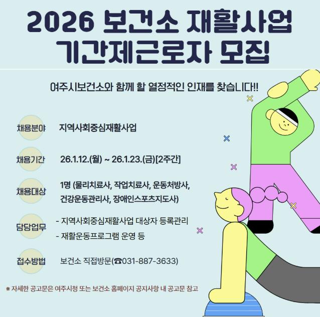 [무한뉴스=정충근 기자] 여주시보건소는 지역 내 등록장애인과 예비장애인들의 건강관리를 위한 지역사회중심재활사업 추진을 위해 1월 12일부터 1월 23일까지 2주간 기간제근로자 채용 공고를 실시한다.