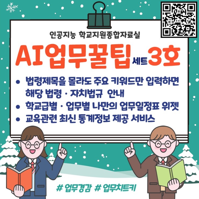 한편, ‘AI 업무꿀팁세트’를 제공하는 학교지원종합자료실은 각종 지침, 공문, 법령 등 행정업무 자료를 원스톱으로 제공하는 온라인 행정지원 플랫폼이다.