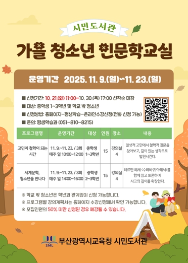 [무한뉴스=정승훈 기자] 부산광역시립시민도서관은 오는 11월 9일부터 23일까지 시민도서관에서 부산 지역 중학생과 학교 밖 청소년 30명을 대상으로 ‘가을 청소년 인문학 교실’을 운영한다.