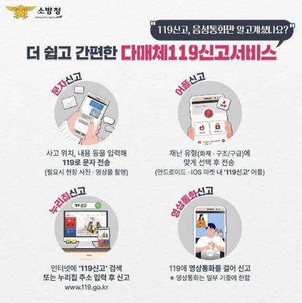 ‘다매체 119신고 서비스’는 기존의 음성통화 외에도 ▲문자신고 ▲앱(App) 신고 ▲영상통화 신고 ▲인터넷 신고(누리집)를 통해 다양한 방법으로 119에 긴급상황을 알릴 수 있는 제도다.