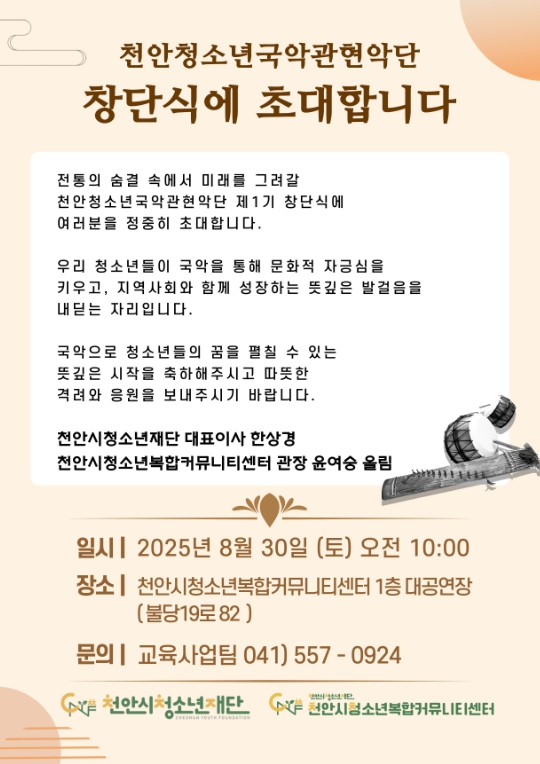 [무한뉴스=정민정 기자] (재)천안시청소년재단 천안시청소년복합커뮤니티센터는 오는 30일 센터 대공연장에서 ‘천안청소년국악관현악단’창단식을 개최한다.