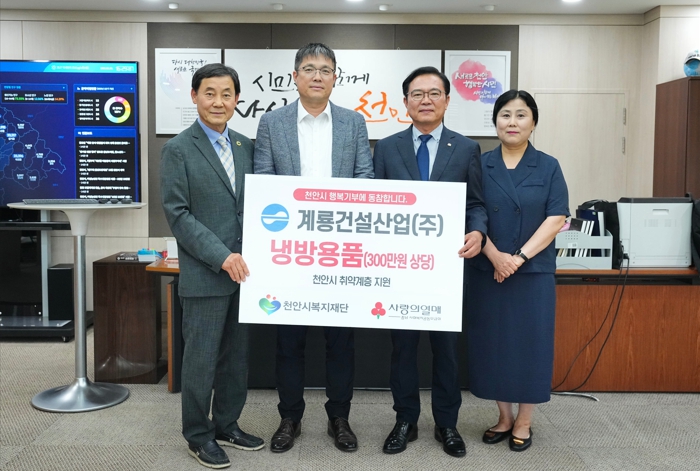 [무한뉴스=정민정 기자] (재)천안시복지재단은 지난달 30일 계룡건설이 천안시청 부시장실에서 주거 취약계층을 위해 300만 원 상당의 냉방용품을 기탁했다고 밝혔다.