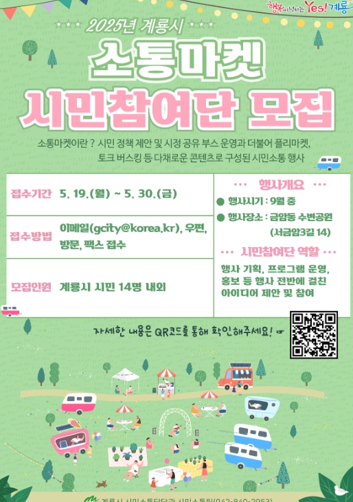 [무한뉴스=정민정 기자] 계룡시는 2025년 공감소통행사 ‘소통마켓’을 함께 만들어갈 시민참여단을 5월 30일까지 공개 모집한다고 밝혔다.
