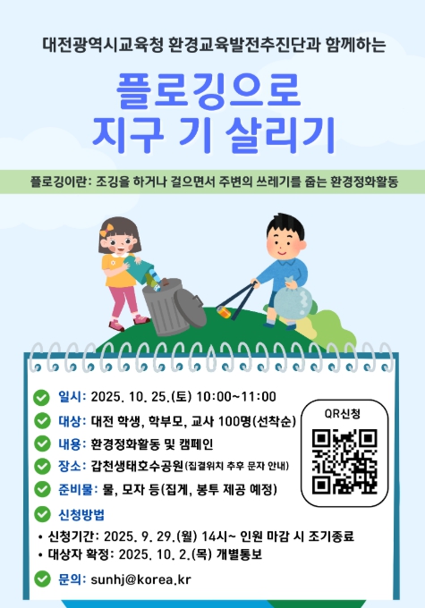 [무한뉴스=정민정 기자] 대전시교육청은 10월 25일 갑천생태호수공원에서 가정‧지역 연계 생태전환교육 실천 확산을 위한 2025년 '지구 기살리기 캠페인' 플로깅을 실시한다고 밝혔다.