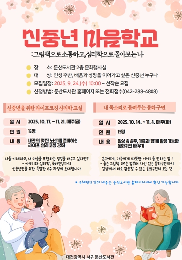 참여를 희망하는 신중년 주민은 이달 24일 오전 10시부터 둔산도서관 홈페이지 강좌 신청 메뉴 또는 전화로 신청하면 된다. 모집은 선착순으로 진행된다.