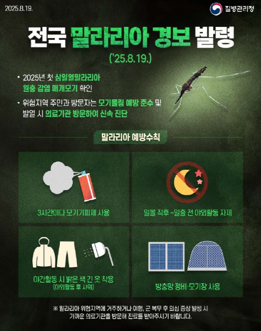 말라리아 예방의 가장 중요한 방법은 모기에게 물리지 않는 것이며 야간 활동 자제, 밝은색 긴 옷 착용, 모기 기피제 사용, 취침 시 모기장 활용 등 기본 예방 수칙을 지켜야 한다. 아울러 가정 내 방충망 점검도 꼭 필요하다.