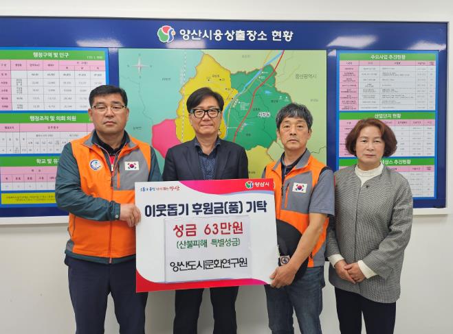 [무한뉴스=최진수 기자] 양산도시문화연구원이 영남지역의 산불피해 극복을 돕기 위해 웅상출장소에 63만원의 성금을 기부했다.
