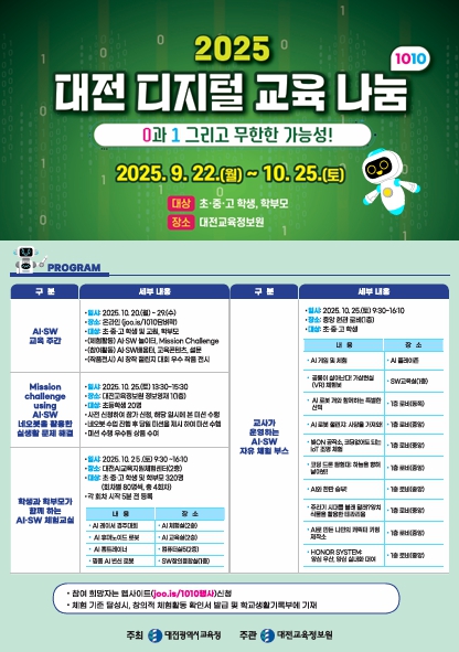 [무한뉴스=정민정 기자] 대전교육정보원은 ‘0과 1 그리고 무한한 가능성’을 주제로 ‘2025년 대전 디지털 교육 나눔1010’ 행사를 9월 22일부터 10월 28일까지 5주간 초·중·고 학생, 교원, 학부모를 대상으로 다채로운 온·오프라인 프로그램을 기획하여 성황리에 운영했다고 밝혔다.