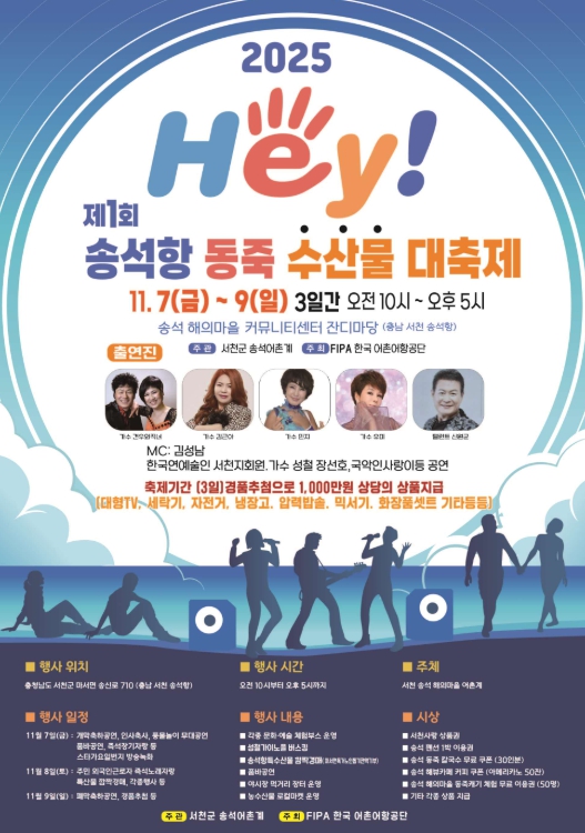 [무한뉴스=정민정 기자] 서천군 마서면 송석어촌계가 11월 7일부터 9일까지 사흘간 송석항 일원에서 ‘제1회 헤이(HEY) 송석항 동죽 수산물 대축제’를 연다.