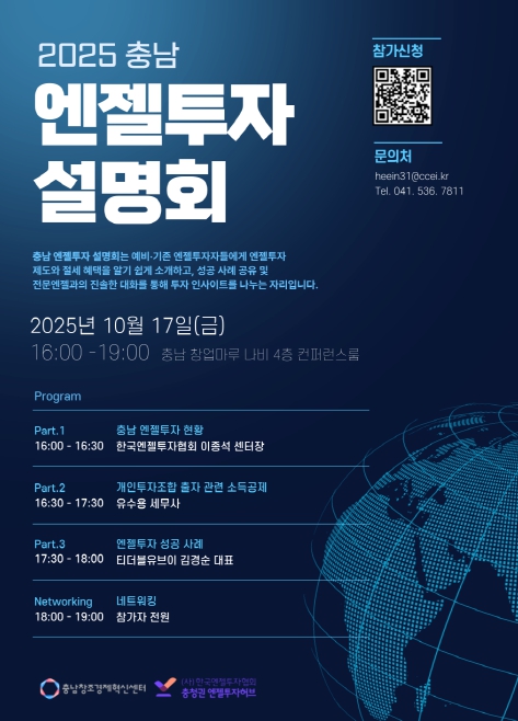 행사는 2025년 10월 17일 오후 4시부터 7시까지 충남 창업마루 나비 4층 컨퍼런스룸에서 개최되며, 충남 엔젤투자 현황, 개인투자조합 출자 관련 소득공제, 엔젤투자 성공 사례 등의 강의가 진행된다.