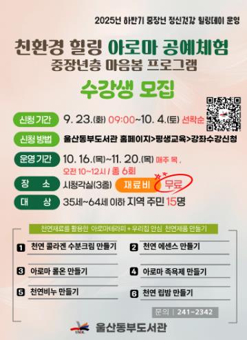 수강 신청 기간은 9월 23일부터 10월 4일까지며, 동부도서관 누리집에서 중장년 15명과 어린이 15명을 선착순으로 모집한다.