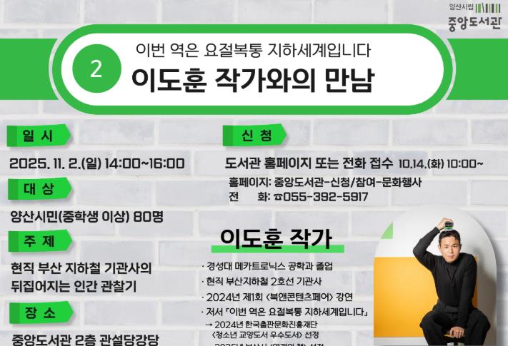 [무한뉴스=최진수 기자] 양산시립 중앙도서관은 11월 2일 이도훈 작가를 초청해 작가와의 만남 행사를 개최한다.