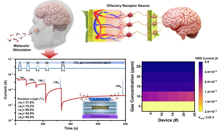 경상국립대학교 박준홍 교수 연구팀은 인간의 후각까지 모방하기 위해 반데르발스 소재인 산화 맥신(Mxene)을 활용하여, 분자의 흡착·탈착에 따른 소자 저항 특성의 준-가역적 제어와 분자 농도에 대해 다진법 연산이 가능한 ‘케미멤리스터’를 제시했다.