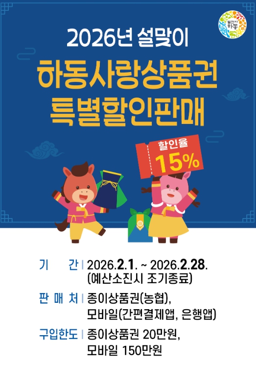 [무한뉴스=최진수 기자] 하동군은 설 명절을 맞아 지역 내 소비를 촉진하고 소상공인의 매출 증대를 도모하기 위해 '2026년 설맞이 하동사랑상품권 특별할인판매'를 실시한다고 밝혔다.