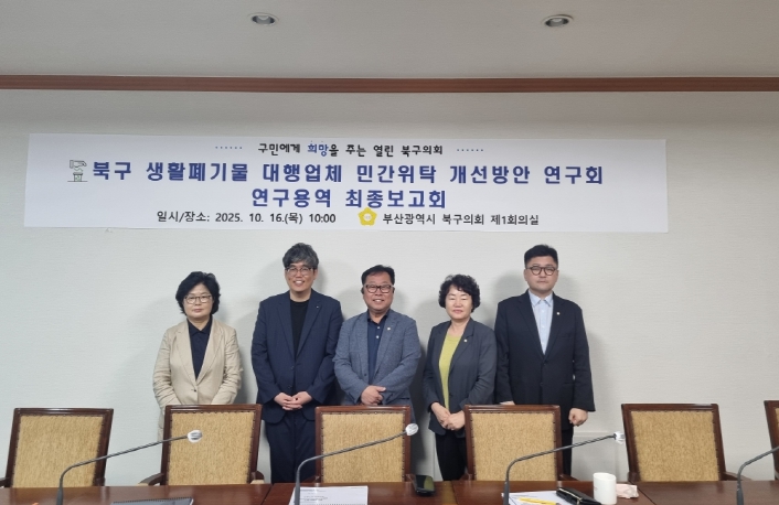 [무한뉴스=최진수 기자] 부산광역시 북구의회 의원연구단체 ‘북구 생활폐기물 대행업체 민간위탁 개선방안 연구회’(대표의원 임성배)가 10월 16일 오전 10시,‘북구 생활폐기물 민간위탁 개선방안 연구용역’최종보고회를 개최했다.