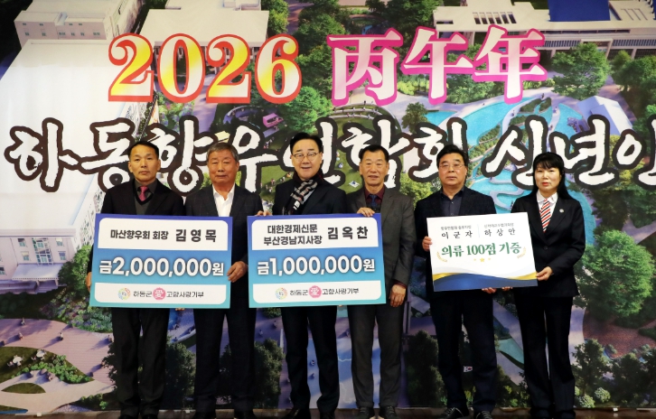 [무한뉴스=최진수 기자] 하동군은 지난 9일 개최된 ‘전국하동향우연합회 2026년 신년인사회’에서 김영목 마산향우회장과 김옥찬 대한경제신문 부산·경남 지사장이 각각 고향사랑기부금 200만 원, 100만 원을 전달했다고 밝혔다.