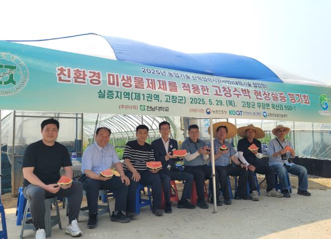 [무한뉴스=정민정 기자] 고창군이 지난 29일 무장면 수박재배농가에서 전남대학교 친환경농업연구소 주관으로 농업기술 산학협력지원사업 평가회를 진행했다.