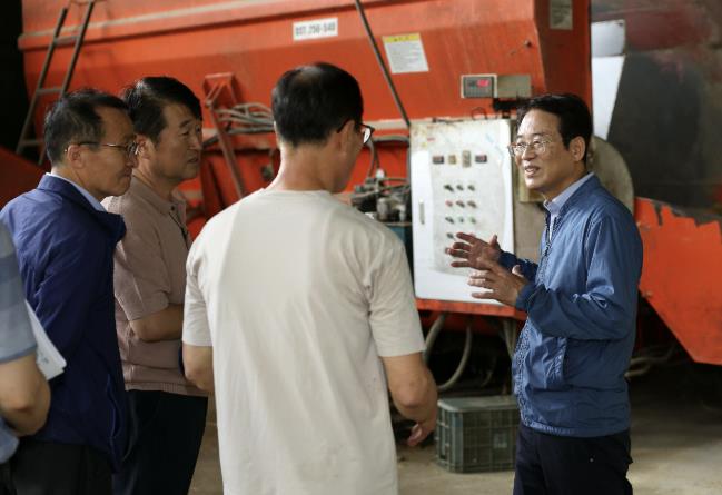 | ▲ 강진원 강진군수가 고급육 생산농가를 방문하여 농가를 격려하고 한우 사육 및 축사시설 현황을 살펴보고 있다. |