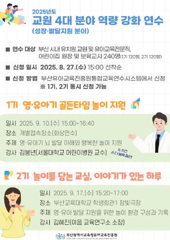 [무한뉴스=최진수 기자] 부산광역시교육청유아교육진흥원은 오는 9월 10일(온라인 연수)과 17일(부산교대 참빛극장) 유치원 및 어린이집 교사 240명을 대상으로 ‘성장·발달 지원 연수’를 운영한다.