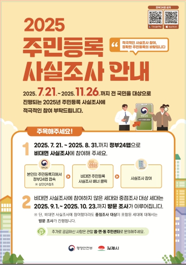 비대면-디지털 조사의 경우 21일부터 오는 8월 31일까지 진행되며, 방문조사는 9월 1일부터 10월 23일까지 이·통장 및 읍·면·동 공무원이 거주지에 직접 방문하여 확인하는 방식으로 진행된다.