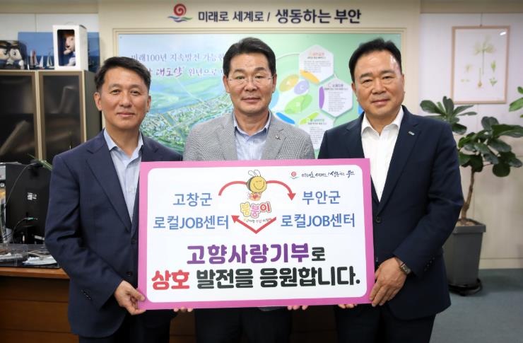 [무한뉴스=정민정 기자] 고창군로컬JOB센터와 부안군로컬JOB센터가 함께 참여한 고향사랑기부제 상호기부 기탁식을 지난 27일 부안군청에서 열었다.