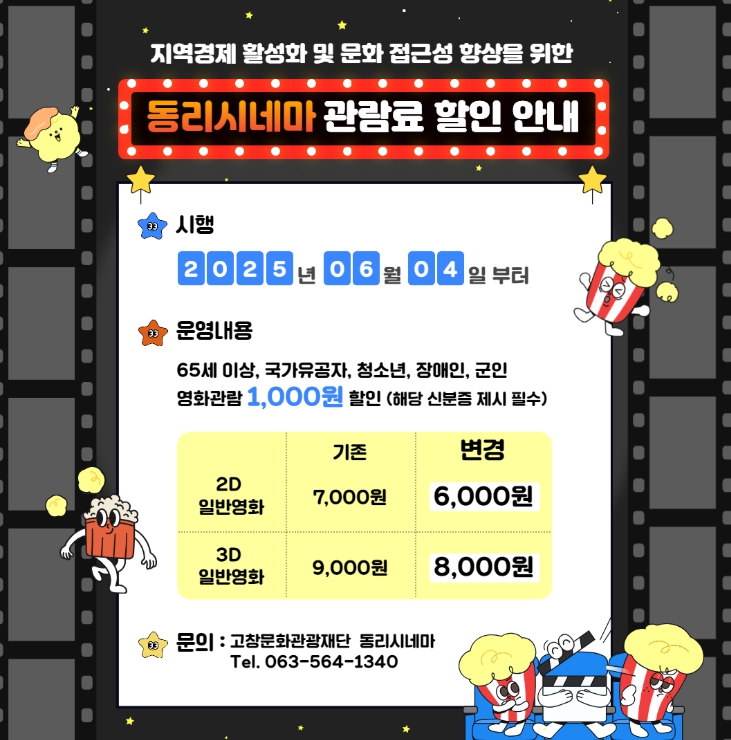 [무한뉴스=정민정 기자] 고창군 동리시네마가 우대계층(65세 이상 어르신, 국가유공자, 청소년, 장애인, 군인) 관람료를 1000원 할인한 6000원으로 영화관람료를 조정했다.