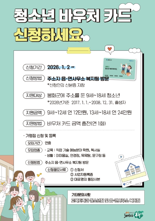 [무한뉴스=최진수 기자] 봉화군은 지역 청소년의 건강한 성장 발달과 복지 증진을 위해 2026년 1월 2일부터 봉화군 청소년 바우처 카드 신청을 받는다.