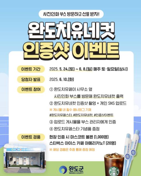 이벤트는 5월 24일부터 6월 8일까지 완도 치유 페이 현장 안내소에 설치된 사진 인화 부스 이용객(선착순 1,000명)에게 기념품을 증정한다.