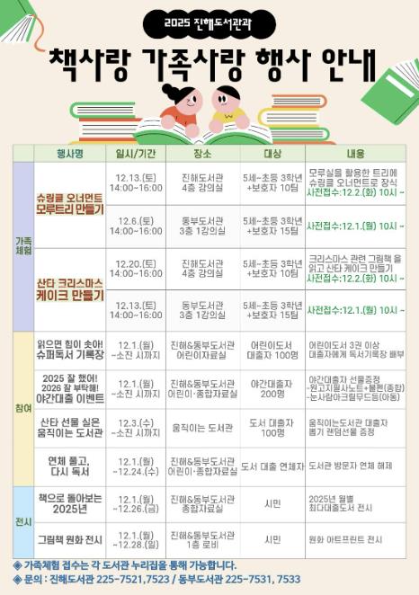 [무한뉴스=최진수 기자] 창원특례시 진해도서관과는 연말을 맞아 가족과 함께 즐길 수 있는 따뜻하고 풍성한 ‘2025 책사랑 가족사랑 행사’를 진해도서관 및 동부도서관에서 12월 한 달간 운영한다.