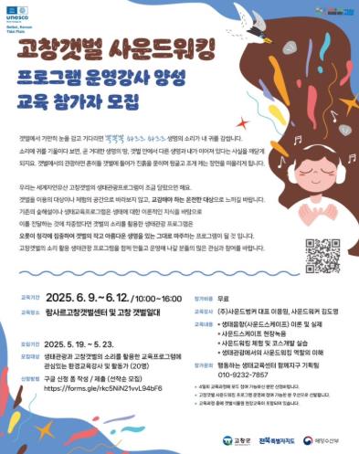 참가대상은 생태관광과 고창갯벌의 소리를 활용한 교육 프로그램에 관심 있는 환경 교육강사 및 활동가 20명으로, 신청은 23일까지 온라인(구글폼)으로 접수 받는다.