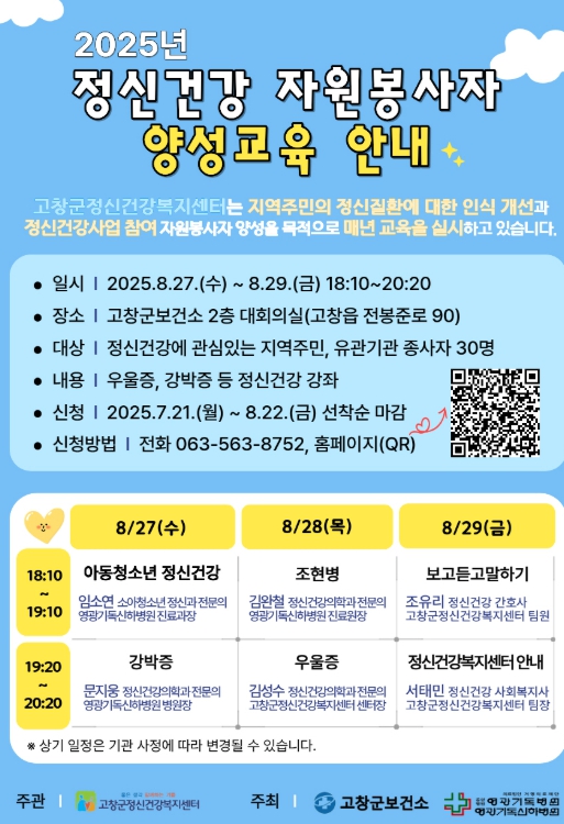 [무한뉴스=정민정 기자] 고창군정신건강복지센터가 오는 8월27~29일 고창군보건소 2층 대회의실에서 실시하는 ‘정신건강자원봉사자 양성교육’에 참여 주민을 모집한다.