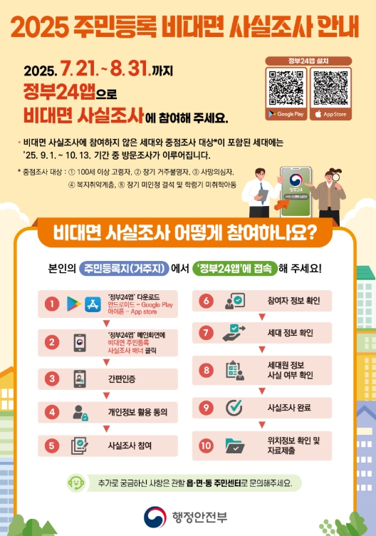 주민등록 사실조사는 주민등록지와 실거주지의 일치 여부를 조사하는 것으로 비대면-디지털 조사(8월31일까지)를 진행한 이후, 읍·면 합동조사반이 방문 조사(9월1일부터 10월23일까지)하는 방식으로 진행된다.