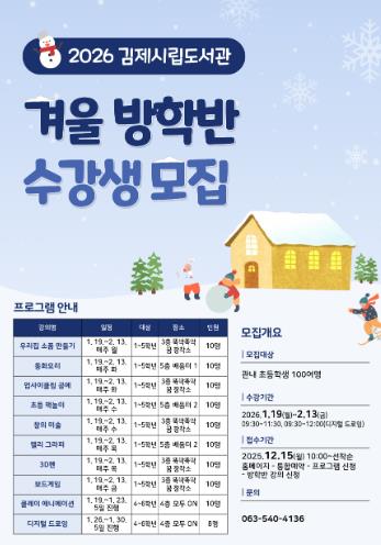 [무한뉴스=정민정 기자] 김제시립도서관은 겨울방학을 맞아 관내 초등학생을 대상으로 겨울 독서교실과 겨울 방학반 프로그램을 오는 2026년 1월 12일부터 2월 13일까지 운영한다고 밝혔다
