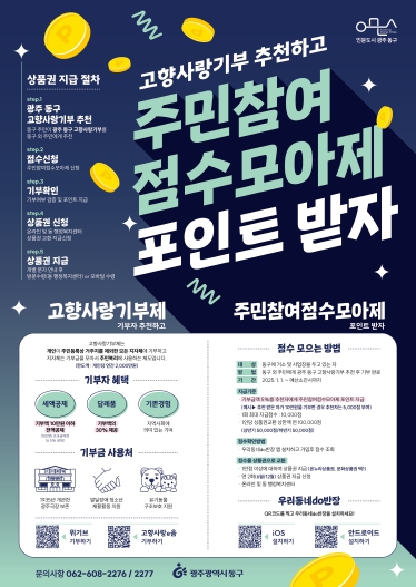 [무한뉴스=정민정 기자] 광주 동구는 관내 거주자와 사업장을 둔 주민을 대상으로 ‘고향사랑기부 주민참여점수모아제’를 홍보·운영하고 이를 통해 모금된 기부금을 활용해 지역에 활력을 불어넣고 주민 복리 증진에 기여하겠다고 밝혔다.