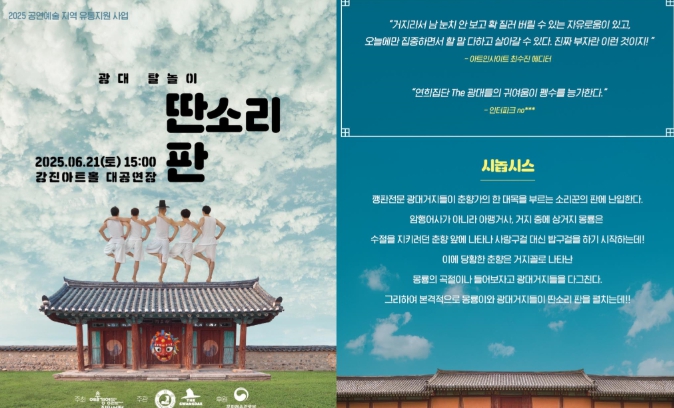 ‘딴소리판’은 문화체육관광부가 후원하고 (재)예술경영지원센터가 주최하는 ‘공연예술 지역 유통지원 사업’을 통해 강진아트홀이 지원받은 우수작품 4편 중 세 번째 공연이다.