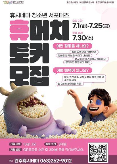 [무한뉴스=정민정 기자] 관객의 시선으로 상영작을 함께 선정하고, 주민이 자꾸만 오고싶은 지역영화관으로 거듭나기 위해 완주휴시네마가 청소년 서포터즈‘휴 머치토커’를 오는 25일까지 공개모집한다.
