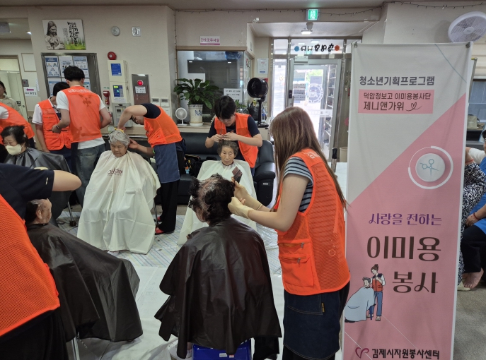 [무한뉴스=정민정 기자] 김제시는 김제시자원봉사센터(센터장 남궁행원)와 덕암정보고(교장 이현승)가 16일 관내 주간보호센터 및 요양병원에 방문해 이미용 봉사단 ‘제니앤 가위’ 학생들과 함께 어르신들을 위한 이미용 봉사활동을 진행했다고 밝혔다.