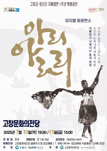 [무한뉴스=정민정 기자] 고창문화의전당에서 고창군-정선군 자매결연 1주년 특별공연 ‘아리아라리’ 공연이 오는 10일(저녁 7시30분), 11일(오후 3시)에 이틀간 열린다.