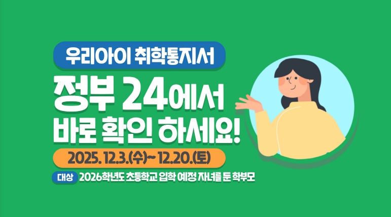 한편, 12월 10일부터 20일까지는 취학아동명부를 기반으로 취학통지서가 우편(등기)으로 발송될 예정이다. 문의사항은 거주지 관할 동 행정복지센터로 연락하면 된다.
