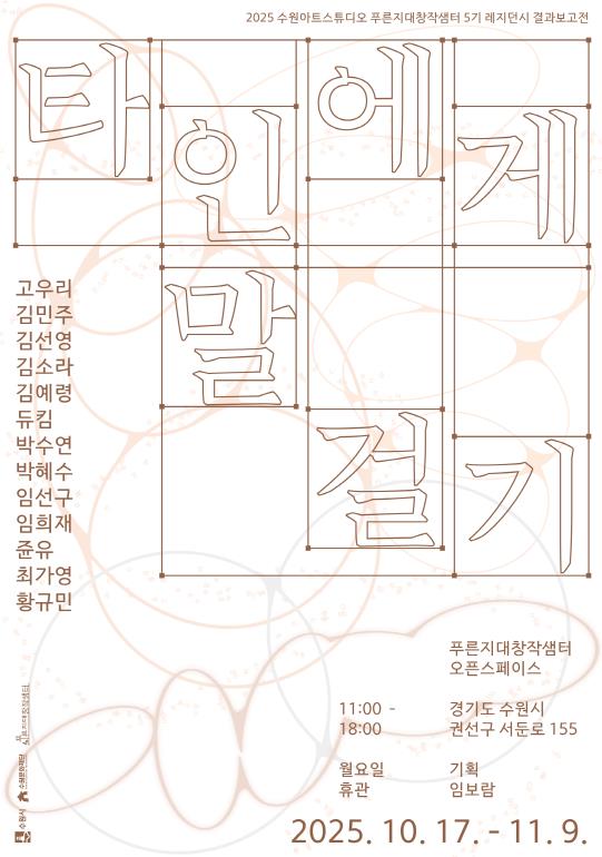 [무한뉴스=양현명 기자] 수원문화재단은 오는 10월 17일부터 11월 9일까지 약 3주간 탑동 시민농장에 자리한 수원아트스튜디오 푸른지대창작샘터에서 5기 레지던시 참여작가 13인의 올 한 해 작품 활동 성과를 공유하는 결과보고전 '타인에게 말 걸기'를 개최한다.