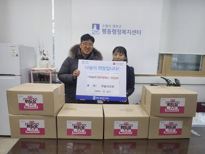 [무한뉴스=양현명 기자] 수원시 권선구 고색동 소재 하늘성교회는 지난 23일 성탄절을 맞이하여 '위드유박스' 21박스를 평동 행정복지센터에 전달했다.