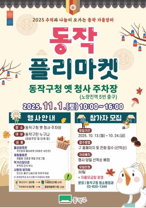 [무한뉴스=정승훈 기자] 동작구가 오는 11월 1일 오전 10시부터 오후 5시까지 구청 옛 청사 주차장(노량진역 5번 출구)에서 ‘2025 추억과 나눔이 오가는 동작 가을장터’를 연다고 밝혔다.