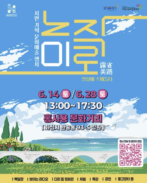 첫 날인 6월 14일에는 ‘제2회 노작미로 백일장’이 열리며, 글밥(김선영) 작가의 초청 강연과 화성시 예술단 국악공연이 함께 어우러져 문학과 예술이 결합된 복합문화행사로 구성된다. 백일장은 초등부부터 일반부까지 시민 누구나 현장에서 참여할 수 있다. 수상작은 6월 28일 두 번째 행사에서 열리는 ‘보이는 라디오’ 무대를 통해 직접 낭독되고, 화성시 오케스트라 공연과 함께 시민들에게 특별한 감동을 전할 예정이다.
