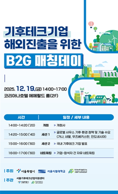 [무한뉴스=정승훈 기자] 19일 서울시는 서울시립대학교, 국가녹색기술연구소와 공동으로'기후테크기업 해외진출 지원을 위한 B2G 매칭데이'를 개최했다. 서울시는 이번 행사가 시의 국제 협력 기반을 활용해 기후테크 분야의 기술·정책 교류를 확대하고, 실질적인 민관 협력 모델을 발굴하기 위해 마련했다고 밝혔다.