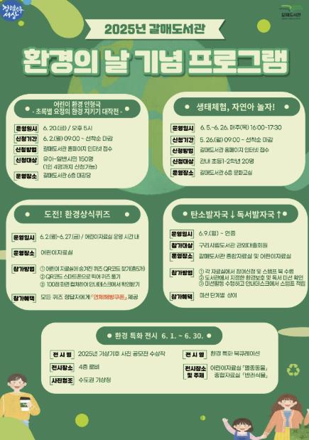 이 외에도 어린이 자료실 내에 숨겨진 QR코드를 찾아 환경 퀴즈를 풀어보는 ‘도전! 환경 상식 퀴즈’, 환경보호와 독서 활동 미션 수행을 통해 환경보호를 실천하고 혜택도 받는 ‘탄소발자국↓ 독서발자국↑’, 2025년 기상 기후 사진 공모전 수상작 전시, 환경 특화 도서 추천(북큐레이션) 오프라인 전시 등을 통해 시민들에게 다양한 즐길거리와 볼거리를 제공한다.