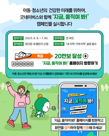 이번 캠페인은 6월 9일부터 7월 30일까지 약 7주간 진행되며, 시민들이 모바일 앱 ‘워크온(Walkon)’을 통해 총 20만 보 걷기 목표를 달성하는 방식으로 운영된다.